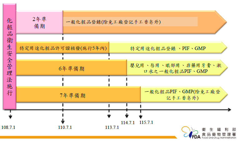 衛生福利部食品藥物管理署(簡稱 TFDA)於 108 年 7 月 1 日起施行「「化粧品產品資訊檔案管理辦法」。
